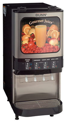 Gourmet Juice® Juice and Drink Dispensing Systems from Bunn-O-Matic Pouring Profits - Dispense more juice profit with BUNN Gourmet Juice Systems. You can make up to 30% more on your non-orange flavors without sacrificing quality by converting to a BUNN Gourmet Juice system. This innovative convertible system gives you the ability to dispense both frozen and bag-in-a-box juice from the same machine! So you can serve premium orange juice from frozen concentrate and (with JDF-4) any three other quality juice flavors from a lower-cost bag-in-the-box system.