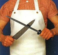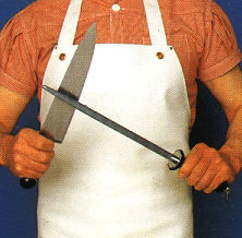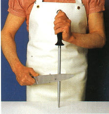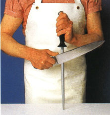 ![]() Hold the sharpening steel at arms length in front of you. The blade is drawn at an angle of approximately 22 degrees against the steel. |